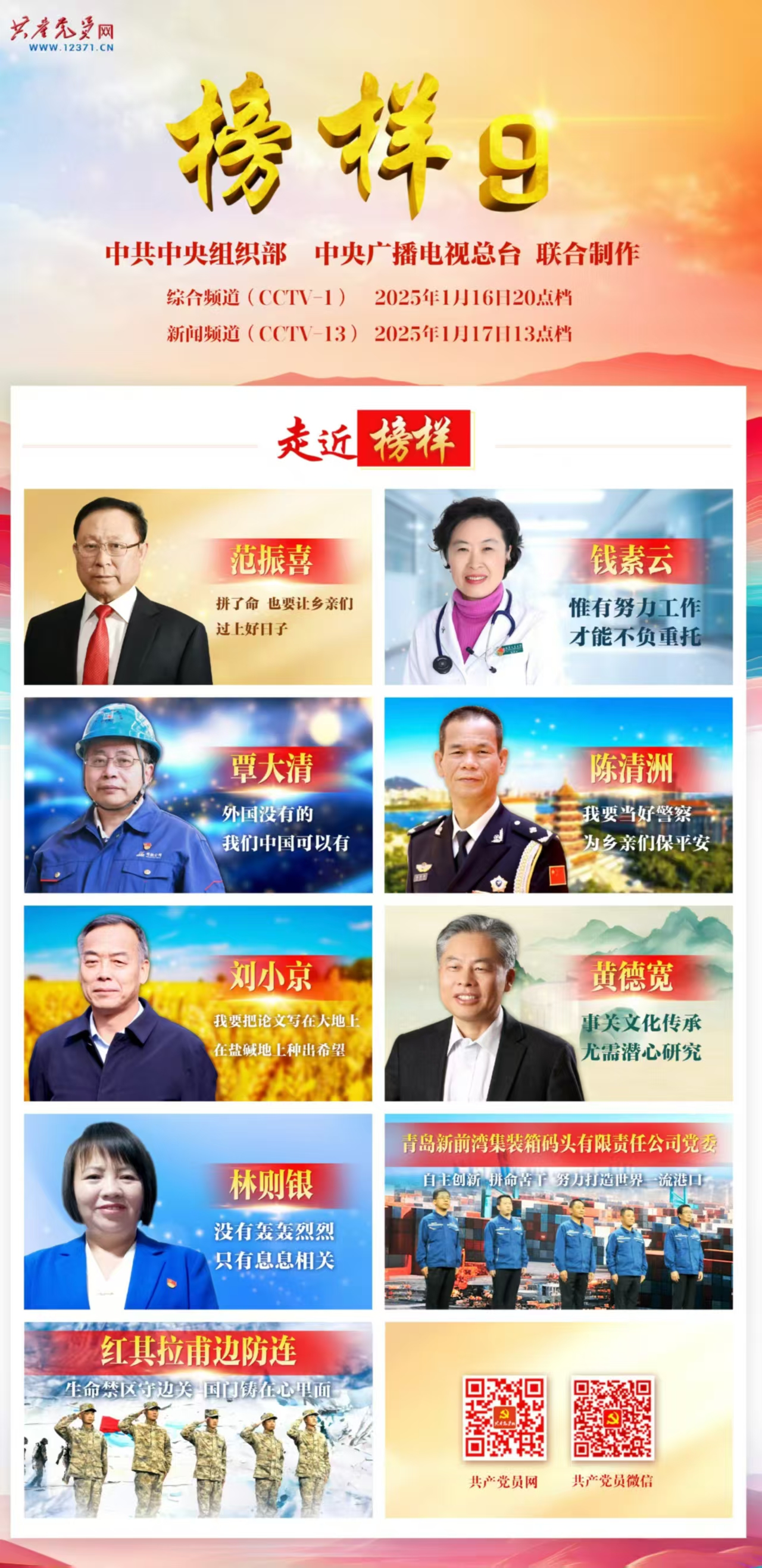 為深入學(xué)習(xí)貫徹習(xí)近平新時代中國特色社會主義思想和黨的二十屆三中全會精神,教育引導(dǎo)基層黨組織和廣大黨員干部學(xué)習(xí)榜樣、爭當(dāng)先進,積極投身中國式現(xiàn)代化建設(shè),中央組織部、中央廣播電視總臺聯(lián)合制作了《榜樣9》專題節(jié)目。節(jié)目邀請范振喜、錢素云、覃大清、陳清洲、劉小京、黃德寬、林則銀7名黨員和山東青島新前灣集裝箱碼頭公司黨委、陸軍某邊防團紅其拉甫邊防連參加錄制,通過典型事跡展示、現(xiàn)場訪談、重溫入黨志愿書等形式,生動展現(xiàn)學(xué)習(xí)踐行習(xí)近平新時代中國特色社會主義思想突出事跡,以及堅定信念、踐行宗旨、改革創(chuàng)新、擔(dān)當(dāng)作為的高尚品質(zhì)和精神風(fēng)范,彰顯基層黨組織戰(zhàn)斗堡壘作用和黨員先鋒模范作用。